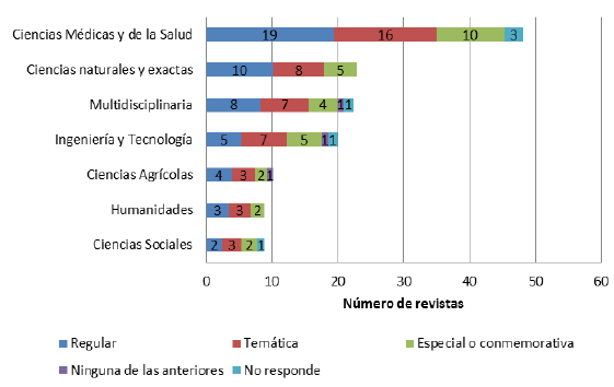 Las áreas específicas a las que pertenecen las revistas que más recurrieron a los CFP en 2015 son: Ciencias Sociales, con un 39,9% (57); seguida de las del área de Ingeniería y Tecnología, con un 18,2% (26); Humanidades, 16,8% (24) y Ciencias Médicas y de la Salud, 11,2% (16). En contraste con esto, las revistas que menos publicaron anuncios de CFP, corresponden a las áreas de Ciencias Naturales y Exactas con un 2,8% (5); Ciencias Agrícolas con 3,5% (6); y Multidisciplinarias con 7,7% (11). Como se muestra en la Figura 6, la frecuencia de publicación de CFP más común es dos veces al año, con excepción de las revistas que corresponden al área de Ciencias Naturales y Exactas.