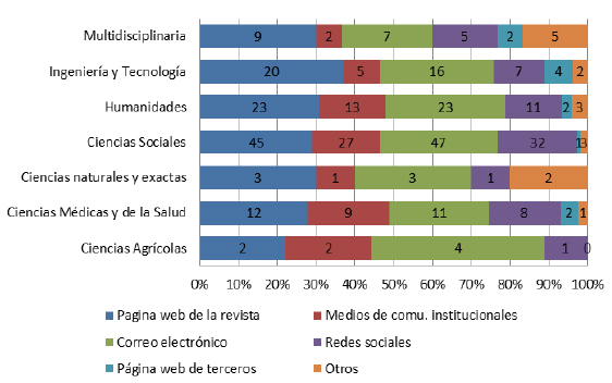 Los medios utilizados por los editores para difundir sus anuncios de CFP son: la página web de la propia revista, un 30% (114); el correo electrónico, 29,5% (111); y, de manera significativa, las redes sociales, 17,2% (65). Los medios de comunicación institucionales como portal web de la universidad, televisión, radio o prensa solo son utilizados por un 16% (59). Las revistas que más utilizan la página web de la propia revista corresponden al área de Ingeniería y Tecnología, seguida por las de Humanidades. Por su parte, las revistas del área de las Ciencias Agrícolas, prefieren el correo electrónico y las de Ciencias Sociales, las redes sociales (Figura 8). En el otro extremo se encuentran las que utilizan páginas web de terceros, pues esta opción solamente fue elegida por un 3% (11), lo cual muestra que los editores no comparten sus anuncios en otros sitios. Por último, la opción “otros medios no especificados” fue escogido solamente por el 4,2% (16).