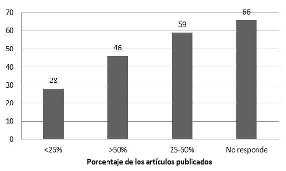 Pero, ¿qué tan efectivos resultaron estos anuncios para atraer artículos suficientes y concretar nuevas ediciones? El 30% de los editores (59) dice que gracias a los CFP pudieron publicar entre un 25 y 50% de los manuscritos recibidos. Otro 23% de los editores (46) señaló que publicó menos del 50%; y el 14% (28) respondió que se publicaron menos del 25% de los manuscritos recibidos (Figura 9).