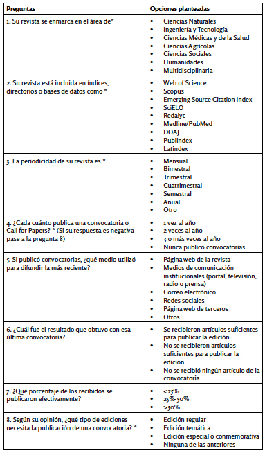 El cuestionario se divide en dos grandes secciones de preguntas; la primera, donde el editor sitúa la revista según el área, el lugar de indexación y la periodicidad (preguntas 1-3); y, la segunda, donde expone sus prácticas en relación con el uso, frecuencia, medios de difusión y resultados que han tenido los anuncios de CFP (preguntas 4-8). Las preguntas 1, 3, 4, 6 y 7 son de tipo cerrado, de elección única con varias opciones de respuesta. Las preguntas 2, 5 y 8 son cerradas de elección múltiple, como se muestra en la Tabla 1.