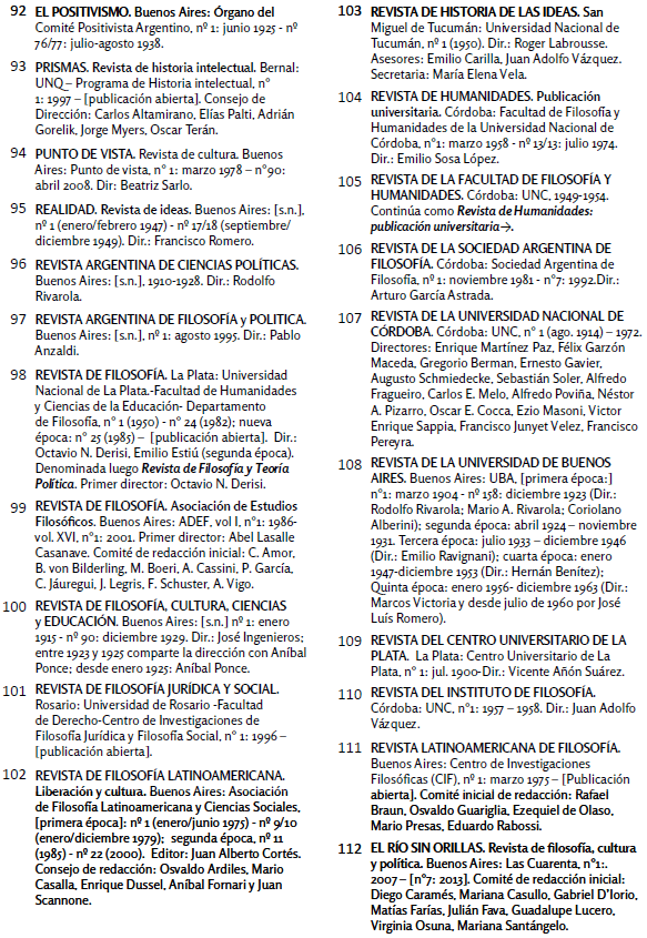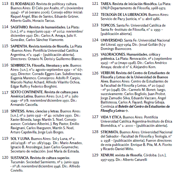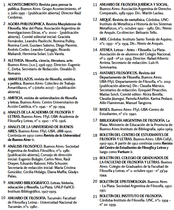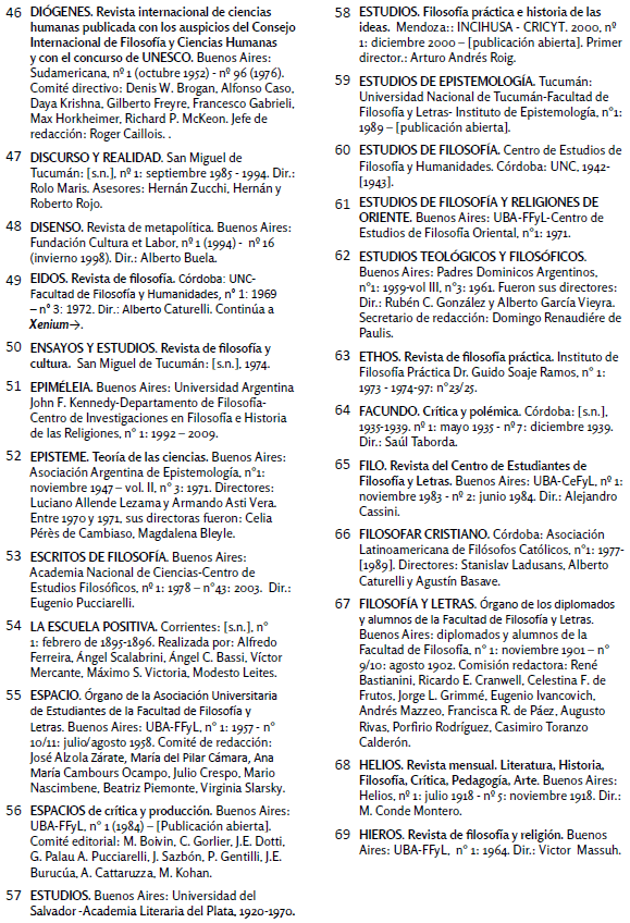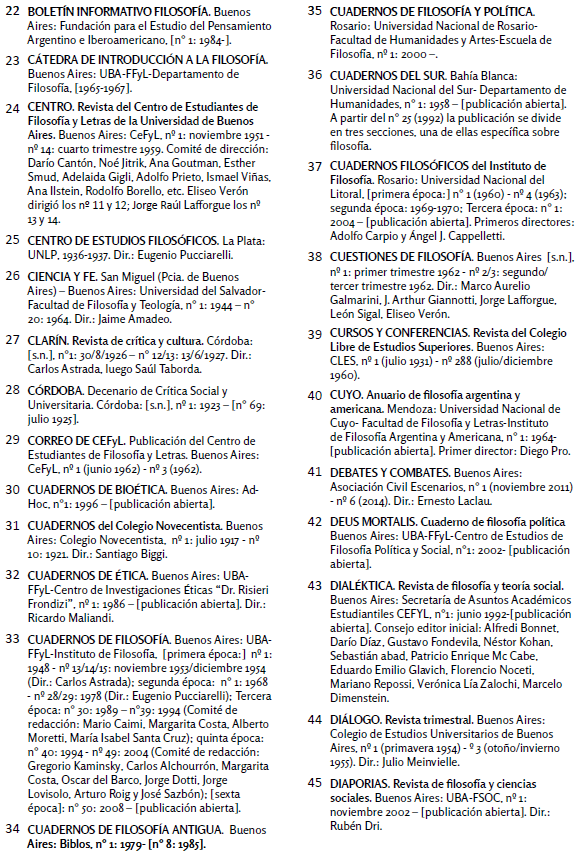 En segundo lugar, desde ya el objetivo de estas páginas no consiste en brindar un análisis de todas las revistas relevadas, sino en presentar ciertas líneas de lectura. De esta manera el período histórico del cual se ocupa el artículo resulta sumamente amplio, ya comienza en los primeros años del siglo xx cuando no existían todavía revistas de filosofía propiamente dichas. Por un lado, esta perspectiva permite observar la continuidad de ciertos proyectos filosófico-culturales a través de las distintas revistas. Por otro lado, desde este punto de vista se pretende proponer una periodización de estas revistas en el proceso de desarrollo de la disciplina, para lo cual elegimos una clasificación retrospectiva de lo que hoy en día consideramos índices de profesionalización de una revista académica. De este modo, en ausencia de mayores trabajos al respecto y como parte de una investigación en curso, estas páginas proponen una cronología preliminar para ubicar las distintas revistas de filosofía publicadas en la Argentina.