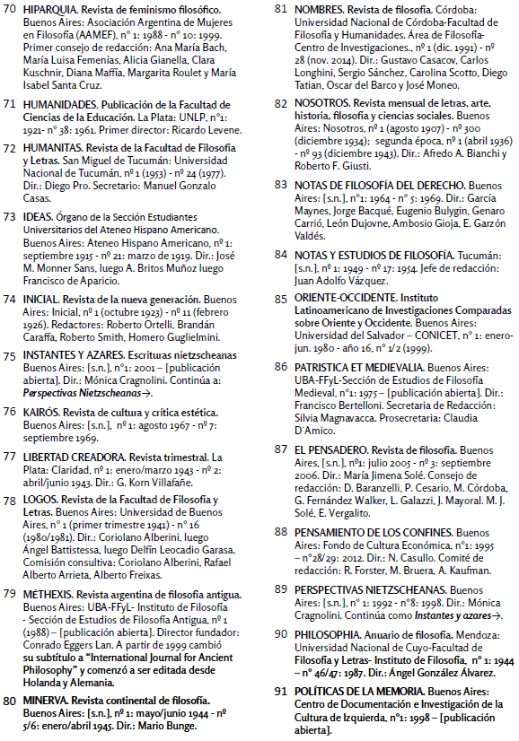 Claramente la cantidad de publicaciones periódicas sobre filosofía fueron en aumento y tomaron las características de profesionalidad que enumeramos en el primer apartado. En 1998 Cassini relevó la existencia de diez revistas argentinas registradas en Philosopher’s Index. Diez años después, Romanos de Tiratel (2008) registró 37 revistas específicas de filosofía en curso, 17 editadas por instituciones públicas y 20 por institutos privados.