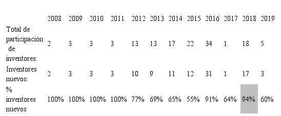 Sobre la incorporación anual de nuevos inventores (Tabla 3), se observa que durante el periodo 2008–2011 el número de inventores ha sido mínimo, en su totalidad nuevos, incrementándose su número del 2012 al 2016, siendo el 2018 el año donde se ha presentado el mayor número de inventores nuevos, para finalmente descender el 2019. Lo anterior coincide con el cambio de tipo patente publicado según la Tabla 1, lo cual puede deberse a que el perfil del inventor ha cambiado a raíz de que la organización se enfocó en patentes de invención en lugar de modelos de utilidad.
