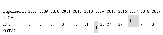 Respecto a las organizaciones, de acuerdo a la Tabla 4, se ha identificado solo dos patentes en colaboración con otras organizaciones: una con una entidad gubernamental peruana: Autoridad de la Zona Franca de Tacna (ZOTAC) y otra con una universidad privada: Universidad Peruana Cayetano Heredia (UPCH).