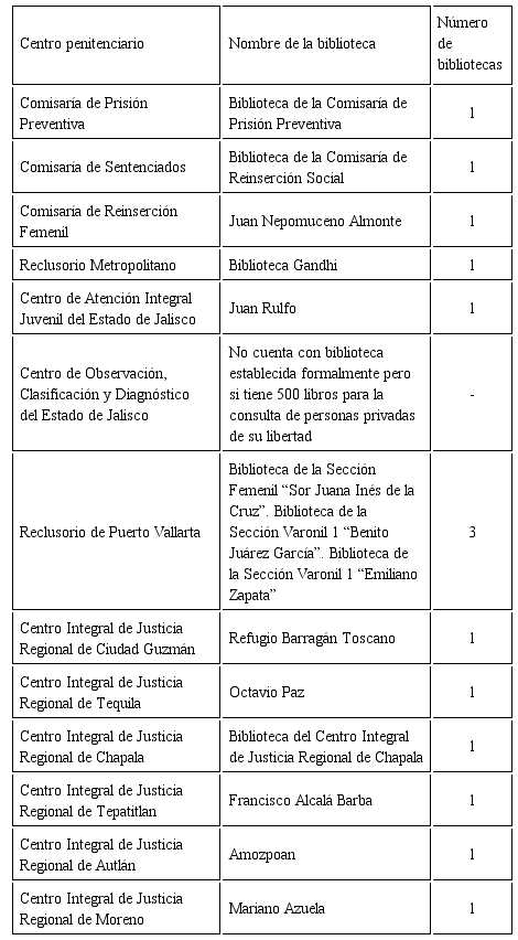 El Estado de Jalisco tiene catorce centros penitenciarios pertenecientes a la Dirección General de Reinserción social, cada uno de ellos cuenta con un espacio dedicado para los servicios bibliotecarios, a excepción de uno de ellos que no posee una biblioteca como tal, pero sin embargo sí presenta una colección de 500 títulos a disposición de los internos (Centro de Observación, Clasificación y diagnóstico del Estado de Jalisco). Por otro lado, el Reclusorio de Puerto Vallarta, cuenta con tres bibliotecas formales para los internos: Biblioteca de la Sección Femenil “Sor Juana Inés de la Cruz”, Biblioteca de la Sección Varonil “Benito Juárez García” y Biblioteca de la Sección Varonil “Emiliano Zapata” (ver tabla I).