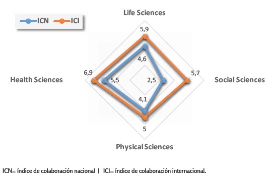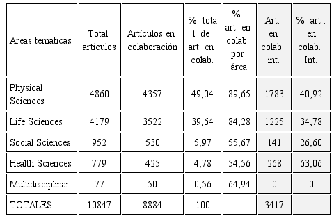 Los mayores porcentajes de colaboración corresponden a las áreas Physical Sciences y Life Sciences, sumando ambos casos casi el 90% de la producción total. También se desprende que casi la totalidad de las publicaciones de estos dos dominios (89,65% y 84,28% respectivamente) generan una producción colaborada. Sin embargo, cuando se observa la participación internacional en esta variable por áreas temáticas se deduce que no existe una correspondencia directa entre los porcentajes generales de colaboración y los calculados para la colaboración internacional. Así, el área Health Sciences es la que presenta una mayor participación de autores extranjeros en las publicaciones (63,06%), seguida por Physical Sciences (40,92%), Life Sciences (34,78%) y finalmente Social Sciences (26,6%). Es importante advertir, no obstante, que el volumen de producción del área con mayor participación extranjera es mucho menor que el de las dos siguientes, por lo que no es posible ser concluyentes en términos de que estas proporciones constituyan un patrón. De igual manera debe valorarse, aunque en el sentido contrario, el área Social Sciences. La única área que no registra colaboración internacional es la Multidisciplinar por lo que, además de ser despreciable en el volumen de producción, no formó parte en el análisis de esta dimensión.