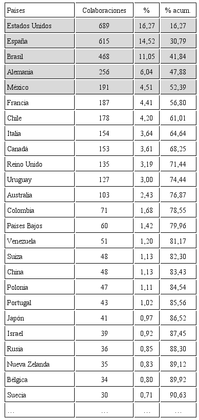 Desde una perspectiva global y en términos de las publicaciones científicas la UNMDP ha colaborado dentro del período estudiado, es decir, a lo largo de casi toda su trayectoria, con 85 países. El número resultante da a entender una gran apertura. Sin embargo, cuando se analiza dónde se concentran las mayores frecuencias de colaboración con autores de otras latitudes se comprueba que el 50% de la producción colaborada internacionalmente se realiza con apenas 5 países, mientras que el 90% de las publicaciones se amplifica a un conjunto delimitado por solo 25 países (Tabla 2).