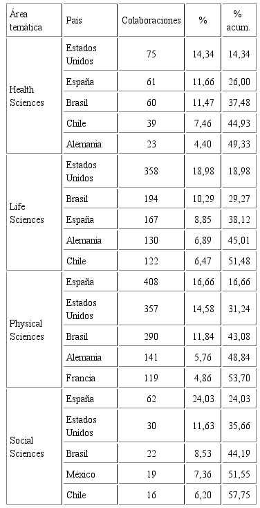 Cuando desagregamos los países con mayor presencia en la colaboración por grandes áreas temáticas tomando como base la acumulación del 50% de la producción se observa que, más allá de las diferentes posiciones y pequeñas variantes, el núcleo de cinco países mantiene la centralidad (Tabla 3). En este agrupamiento se suma Chile como uno de los países que también mantiene uno de los flujos de intercambio más importante a nivel regional. En el área Social Sciences la presencia por demás destacada de España obedece fundamentalmente a la cuestión idiomática, ya que el total de publicaciones colaboradas con autores de este país está publicada en lengua española.