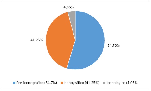 Además, se cotejaron los datos relativos a niveles de significación de acuerdo al método iconológico de Panofsky, en función de la observación y el análisis efectuado en las descripciones en el área de notas. De acuerdo a los valores establecidos para cada una de las bibliotecas, se identificaron como pre-iconográficos el 54,7% de los registros, como iconográficos el 41,25% y como iconológicos sólo un 4,05%