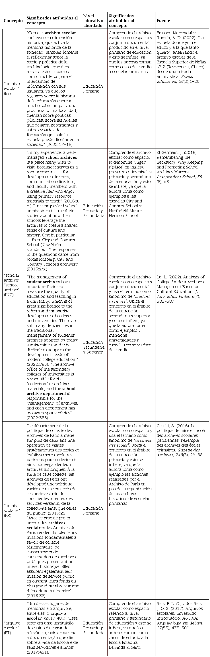 Para la construcción de esta categoría, se identificó como concepto de interés el “archivo escolar”, en los idiomas que son pertinentes para esta investigación. En tal sentido, los conceptos de interés son “archivo escolar”, “scholar archive”, “archive scolaire” y “arquivo escolar”; y el término sustituto se utilizó solamente para el idioma inglés –“school archive”– ya que se ha observado que artículos fueron recuperados utilizando las dos formas de escritura.