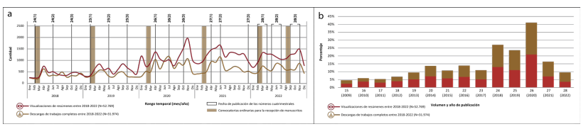 Por último, durante el rango temporal bajo estudio se realizaron tres importantes desarrollos editoriales que involucraron: a) la implementación de un plan de comunicación sociodigital, b) la adopción de la modalidad continua para la publicación de contenidos y c) el cambio en la frecuencia de las convocatorias para la recepción de manuscritos. En primer lugar, el plan de comunicación sociodigital fue puesto en funcionamiento a partir de abril de 2021 e incluyó el desarrollo de una estrategia de difusión activa (Codina y Lopezosa, 2020), que requirió el diseño de un cronograma articulado entre la producción editorial y la difusión sociodigital, así como la incorporación del rol de community manager dedicado a la selección, adaptación y difusión sistemática de contenidos en redes sociales (ver Kligmann, Funes y Spengler, 2024). En segundo lugar, con el objetivo de agilizar la circulación social del conocimiento producido y potenciar su acceso por parte de los lectores, en 2022 comenzó a utilizarse el sistema de publicación continua. Esta modalidad permitió la entrega semanal de contenidos a medida que estos superaban favorablemente las distintas instancias del proceso editorial, manteniendo la periodicidad cuatrimestral organizada en volúmenes y números o fascículos (Aparicio, Banzato y Liberatore, 2016; Baiget, 2020). Finalmente, y en respuesta a la demanda de los autores, se procedió al desdoblamiento de la convocatoria para la recepción de manuscritos, que pasó de ser anual a semestral.