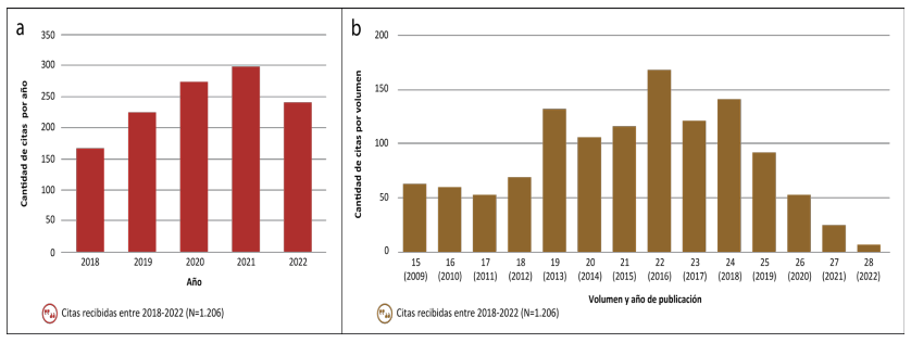Finalmente, mediante Google Scholar Citations fue posible obtener métricas del número de citas recibidas entre 2018 y 2022, para cada uno de los trabajos con referato publicados digitalmente. Durante el rango bajo estudio fue posible registrar un total de 1.206 citas, que evidencian un crecimiento anual progresivo, con un pico máximo durante el año 2021 (Figura 7.a). Posteriormente, durante 2022 la cantidad de citas recibidas disminuye levemente (Figura 7.a). Al igual que para los indicadores de visualización y descarga, en este caso también se cotejó el año de publicación de los contenidos citados durante el período bajo análisis. De esta manera, se observa que la tasa de citación de los trabajos publicados entre 2009 y 2012 es relativamente baja (Figura 7.b). Dicha tendencia se incrementa para los contenidos disponibles a partir de 2013, alcanzando valores máximos para los trabajos correspondientes a 2016. Luego, entre 2018 y 2022 se observa un decrecimiento gradual en la cantidad de citas recibidas, que arroja valores mínimos para los contenidos publicados en 2022.
