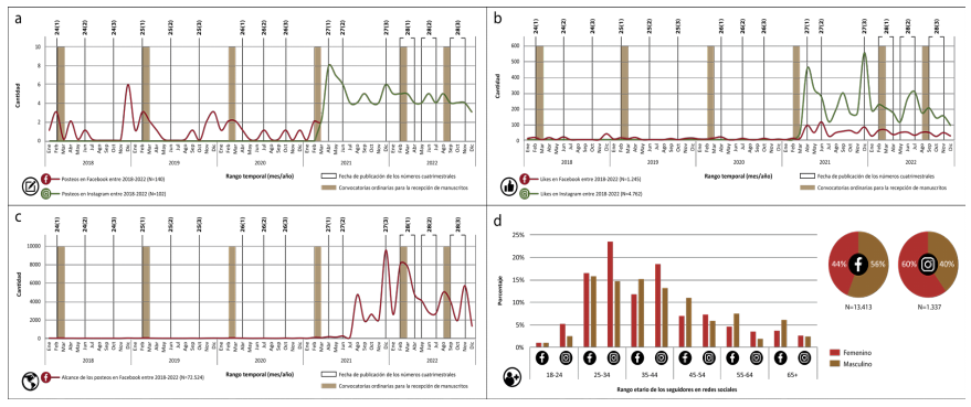 Para evaluar la visibilidad de la revista en las redes sociales se registró la cantidad de posteos y likes (Figuras 2.a y 2.b), así como el alcance de los posteos (Figura 2.c) y los datos demográficos del número de seguidores en cada plataforma de interacción (Figura 2.d). Respecto al número de posteos en la red social Facebook, entre 2018 y 2020 se observa una frecuencia de publicación errática, con presencia de gran cantidad de meses sin actividad (Figura 2.a). De hecho, tanto en 2018 como en 2019 se publicaron 13 posteos en cada año. Además, la actividad en esta red social descendióen el 2020, siendo en total nueve los posteos publicados. Es a partir del año 2021 cuando aumenta significativamente la cantidad y frecuencia de posteos mensuales en ambas redes sociales, registrándose actividad constante en las cuentas.