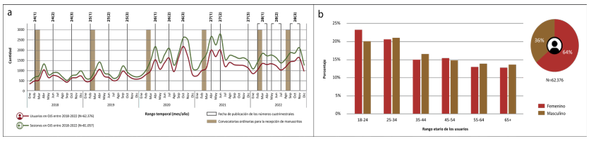 En este caso se registró el número de usuarios y sesiones entre 2018 y 2022. Durante este lapso se alcanzó un total de 62.376 usuarios que interactuaron con la página web de la revista en 81.057 sesiones, lo que equivale a un mínimo de una sesión por usuario (Figura 3.a). Si bien los valores entre 2020 y 2022 presentan fluctuaciones, se muestran muy superiores a los del período 2018-2019. Por otra parte, los picos con mayor cantidad de usuarios y sesiones parecen coincidir especialmente con la publicación de nuevos fascículos de la revista.