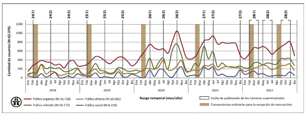 En el presente trabajo se diseñó una metodología específica para evaluar el impacto de la implementación del plan de comunicación sociodigital en la revista Arqueología abarcando el período 2018-2022. Esta selección temporal se justifica en la necesidad de analizar los resultados en el contexto de las transformaciones digitales y evaluar comparativamente las etapas previas y posteriores a la implementación de dicho plan, ejecutado en abril de 2021 (Kligmann, Funes y Spengler, 2024). Cabe mencionar que, el año 2020 es considerado estadísticamente anómalo debido a los efectos de la pandemia de COVID-19 en el consumo de Internet (Cervantes Hernández y Chaparro-Medina, 2021). Por lo tanto, la fecha de inicio del análisis se estableció en 2018, coincidiendo con importantes desarrollos digitales en el marco de la revista (mencionados en el acápite anterior), y se cerró en 2022, siendo el último año completo al momento de esta investigación.