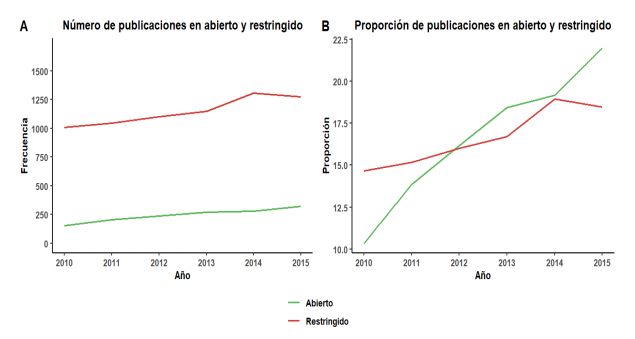 Así, desde el año 2010 ha habido un incremento paulatino de las publicaciones en abierto hasta el 2015 del 11,65 % y una media de crecimiento anual aproximado de 2,33 % con una desviación estándar de 1,01. Únicamente entre el año 2013 y 2014, el crecimiento fue por debajo de un punto porcentual, con un valor de 0,75 %. Mientras tanto, las publicaciones con acceso de restricción por pago han variado muy poco, con una media de crecimiento anual de 0,76 % y una desviación estándar de 0,97 %.
