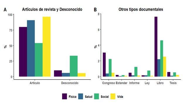En cuanto a la distribución por áreas de conocimiento, existe una marcada correspondencia entre su productividad y la tipología documental. Así, en un análisis sobre la producción total, los artículos científicos son los más habituales en todas las ciencias, siendo notable la producción de artículos de las Ciencias Físicas (17,53 %), tanto en solitario como en contribución con otras ciencias como, por ejemplo, de acuerdo con la Tabla 3b, en combinación con las Ciencias Sociales (2,8 %) o las Ciencias de la Vida (3,46 %). Esta predominancia absoluta del artículo científico se corrobora atendiendo asimismo a los porcentajes marcados por este tipo documental cuando se analiza exclusivamente, ya no sobre el total, sino sobre los documentos producidos por cada área. En todos los casos, el artículo científico supera el 70 % de la producción.