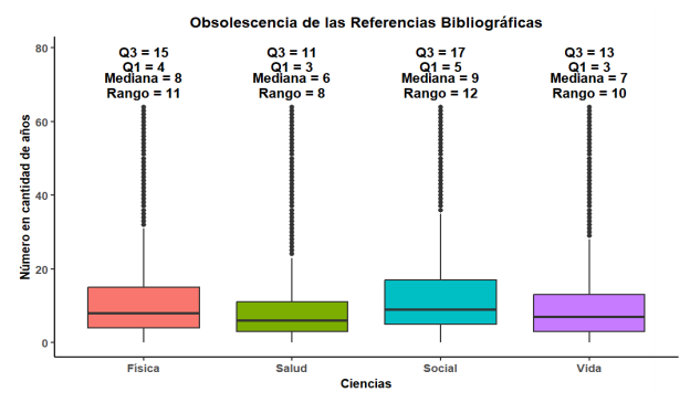 En el procesamiento para identificar el año de publicación de las referencias bibliográficas se encontraron valores que generan inconsistencias para determinar la edad de las fuentes (por ejemplo, algunos datos anómalos se presentan en edades con una mínima fijada en un valor negativo) y que tuvieron que ser eliminados. Es preciso comentar que ello puede ser consecuencia de una mala práctica en la descripción de los recursos o de errores en el procesamiento de las referencias, algo sorprendente atendiendo a la exigencia de las editoriales durante los procesos de revisión y aceptación de propuestas de artículos. Además, en muchos casos, este problema se debe a la incompletitud de los datos en la descripción de la fuente recogida en la referencia bibliográfica. Finalmente, se constata que las distintas áreas de conocimiento tienen ritmos de actualización diferentes, las Ciencias de la Salud se presentan como las que más rápido actualizan sus resultados, seguidas por las Ciencias de la Vida, las Ciencias Físicas y por último las Ciencias Sociales.