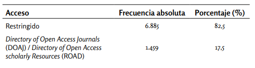 Como puede apreciarse en la Tabla 4, el acceso restringido domina la escena (82,5 %), frente al porcentaje considerablemente menor de publicaciones realizadas en acceso abierto (17, 5 %), que suponen menos de la quinta parte del total de publicaciones.