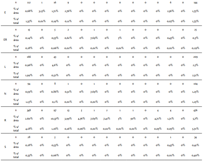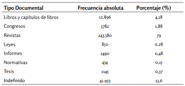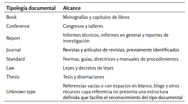 Respecto a las referencias que no pudieron ser incluidas en un tipo documental (13,6 %), esta circunstancia obedece a las dudas generadas por la ambigüedad o la incompletitud de los datos. Algunas de estas referencias pueden ser URL (siglas de Uniform Resource Locators en inglés) de páginas web sin fecha, incompletas, caducadas o sin título. En todo caso, se trata de materiales que generan confusión en su descripción y errores de procesamiento, ya sea por los autores del documento que lo referencian o por el procesamiento propio de la automatización en el proceso de identificación y extracción del tipo de documento.