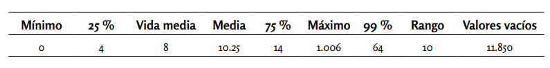 En las referencias bibliográficas extraídas de la producción se encontraron un total de 11.850 ítems sin fecha declarada. En cuanto a la consulta de documentos antiguos, la máxima apunta a poco más de mil años (1006), según se aprecia en la Tabla 6. Si bien es probable que se consulten documentos históricos o fuentes primarias, como documentos de archivo, se consideró prudente no tomar en consideración estas edades, especialmente porque se trata de fuentes complejas de rastrear por el tipo de acceso debido a las características propias del material. El problema de contemplar valores extremos en la determinación de la obsolescencia de las fuentes es que distorsionan las medidas de centralidad y, como consecuencia, aumentan los valores medios de concentración de las edades de las referencias. Por esta razón, se discriminaron dichos valores, que representan el 1 % del total, para analizar el 99% restante, que aglutina los documentos que mostraban una edad comprendida de los 0 hasta los 64 años.