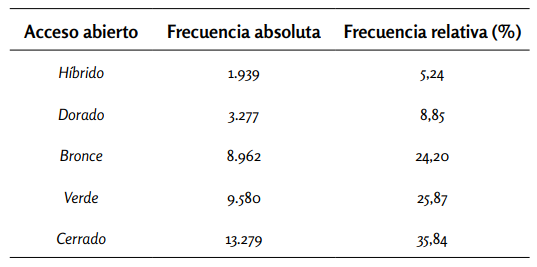 A través de los DOI hallados en las referencias bibliográficas se identificaron un total de 37.037 referencias en la plataforma Unpaywall, constituyendo esta cifra el 12,02 % del total. Esto no significa que todas estas referencias bibliográficas estén en abierto, puesto que algunos de estos recursos permanecen cerrados durante un periodo de embargo, tal y como se aprecia en la Tabla 7, lo que provoca que disminuya la cantidad de documentos que se consultaron en abierto y que se encuentren disponibles en esta plataforma.El acceso restringido continúa dominando entre las fuentes citadas (35,84 %), seguido de las vías verde (24,20 %) y bronce (24,20 %).