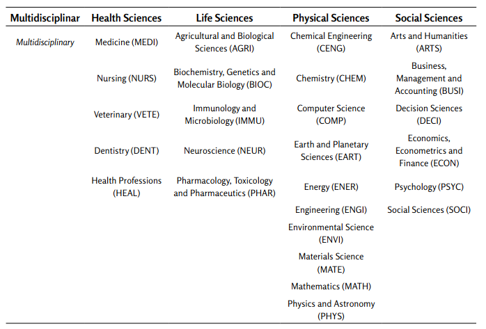 Las áreas de conocimiento a las que se circunscriben las publicaciones estudiadas se corresponden con la clasificación predefinida por Scopus. Se han establecido así cuatro grandes áreas (Tabla 1): Ciencias de la Salud (Health Sciences), Ciencias de la Vida (Life Sciences), Ciencias Físicas (Physical Sciences) y Ciencias Sociales (Social Sciences) y un campo Multidisciplinar.