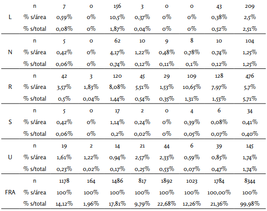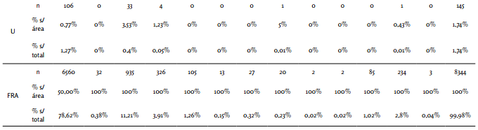 En cuanto a la colaboración científica entre áreas, destaca el primer bloque cuya frecuencia acumulada total es de 87,87 % y que lo integran las cuatro grandes áreas de conocimiento, Ciencias Físicas (22,68 %) como mayor productora, Ciencias de la Salud (17,81 %), Ciencias Sociales (12,26 %) y Ciencias de la Vida (9,79 %). Además, se encuentran los ítems vinculados a la categoría “Unknown area” (14,12 %) y las publicaciones realizadas en colaboración entre las Ciencias de la Salud y las Ciencias de la Vida (11,21%).