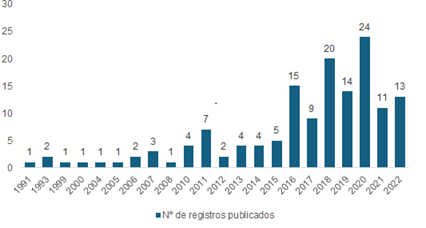 La primera de estas secciones hace referencia al año de publicación de cada uno de los registros analizados (Gráfico 1). Esto permite conocer la evolución que ha experimentado la preocupación por la accesibilidad y la inclusión de las personas con discapacidad en el entorno bibliotecario a través de la producción científica.