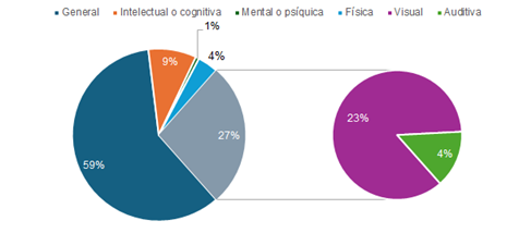 Por último, una parte importante de este análisis de datos corresponde a la clasificación de los artículos o actas de conferencia según la discapacidad a la que hacen referencia. Debe tenerse en cuenta que muchos de los documentos analizados no tratan una discapacidad específicamente, sino que tienden a mencionar o centrarse en varias de ellas. Otro detalle es el que corresponde a una gran parte de la muestra que trata la discapacidad en términos generales, es decir, sin enfocar el trabajo a unas necesidades concretas.