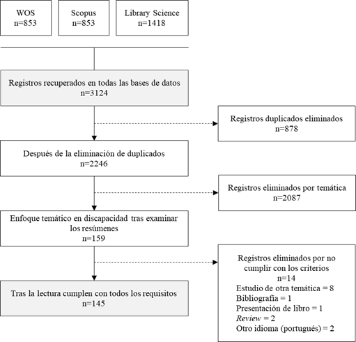 Como puede apreciarse en la Figura 1, el número de registros resultantes de las búsquedas realizadas fue de 3.124. Tras eliminar los duplicados y aquellos que no correspondían con los criterios de inclusión, quedaron 2246 artículos que incluyeron en su título, palabras clave o resumen los términos de “accesibilidad” o “inclusión” y “biblioteca” (o derivados). Luego, se revisaron todos los resúmenes para determinar cuáles centraban su enfoque en las personas con discapacidad, siendo estos 159 registros. Con la lectura en profundidad de cada uno de los artículos, se estableció que algunos de ellos no cumplían con los requisitos, como sí indicaban sus metadatos, con lo que resultó que el conjunto de datos utilizado para la elaboración de este estudio comprendió un total de 145 registros.