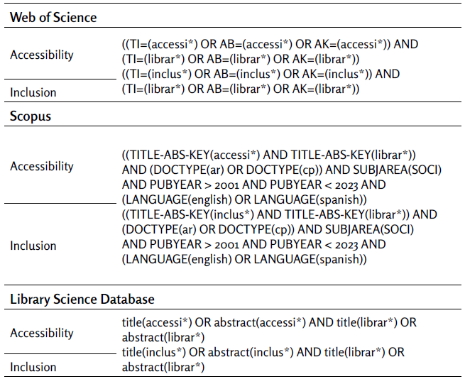 La estrategia de búsqueda se ha estructurado con el objetivo de recuperar en cada una de las bases de datos mencionadas aquellos artículos científicos o conference papers en cuyo título, palabras clave o resumen se hiciera uso del concepto de “accesibilidad” o “inclusión” (y derivados) vinculado al de “biblioteca”. Se buscaron específicamente aquellos trabajos publicados entre los años 1972 y 2022 en revistas especializadas en Biblioteconomía y Documentación, ya sea en inglés o en castellano (Tabla 2). Así: