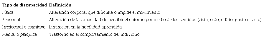 Aunque el lenguaje utilizado en esta clasificación es neutral, de modo que pueda ser utilizado por todas las personas y en diferentes ámbitos, se extrae de la misma que existen cuatro tipos de discapacidades, reflejadas en la Tabla 1 (OMS, 2001):