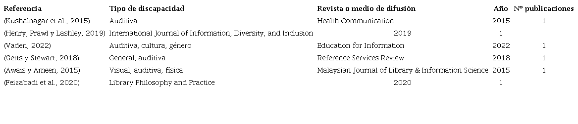 Cada uno de los artículos que abordan la discapacidad auditiva fueron publicados en diferentes revistas o medios de difusión entre 2015 y 2022. Se mencionó exclusivamente esta discapacidad en dos de ellos, mientras que el resto la abordó junto con otras discapacidades, como es el caso de la visual y la física, o incluso considerándola parte de un compendio de características diversas que incluyen también cuestiones de género y culturales.