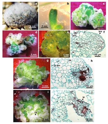 El análisis histológico permitió caracterizar el origen y desarrollo de los brotes a partir de los callos organogénicos. Se observaron tres etapas identificadas como estadio 1 (inicial; 60 días); estadio 2 (intermedio; 90 días) y estadio 3 (diferenciado; 120 días). En el inicial, el callo estuvo formado por células de parénquima, isodiamétricas de paredes delgadas con granos de almidón. También se observó actividad meristemática subepidérmica que promovió el levantamiento de una protuberancia globosa, caracterizada por la diferenciación de procambium en la parte central (Figura 1e-f). En el estadio intermedio, el callo se tornó de un color más verde y aumentó el número de brotes con mayor grado de diferenciación.