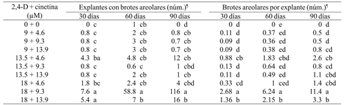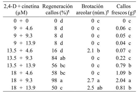 Segmentos de 5-8 cm de longitud de tubérculo con areola se sembraron en frascos de 45 mL de capacidad con 15 mL de medio de cultivo básico MS (1962) adicionado con 2,4-D (9, 13.5 y 18 µM) combinadas con cinetina (4.6, 9.3 y 13.9 µM) y medio sin reguladores de crecimiento como testigo. A las cuatro semanas de cultivo se cuantificaron la formación de callos (%), la brotación (número de explantes con brotes) y el número de brotes por explante. El diseño experimental fue completamente al azar, donde cada tratamiento estuvo representado por 10 repeticiones y la unidad experimental fue un explante areolar por frasco.