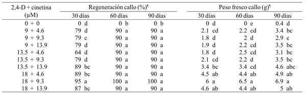 Los brotes y callos obtenidos en la etapa de inducción de callos y brotes se subcultivaron tres veces (30, 60 y 90 días) a los mismos medios de cultivo para promover la organogénesis indirecta y la multiplicación de brotes. Todas las dosis de auxinas promovieron la proliferación de los callos (p≤ 05). El mayor crecimiento de callos de apariencia friable se logró con 18 µM de 2,4-D y 9.3 µM de cinetina; a los 30 días del subcultivo triplicaron su peso inicial al pasar de 2 a 6 g. A los 60 y 90 días de cultivo la tasa de crecimiento se redujo y los callos alcanzaron un peso promedio final de 6.9 g (Cuadro 1 y 2).