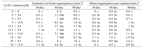 La producción de brotes en esta etapa del proceso fue resultado de la activación de yemas axilares presentes en los explantes; sin embargo, sólo se obtuvo con la combinación de 2,4-D (18 µM) y cinetina (9.3 y 13.9 µM). Estas concentraciones favorecieron la regeneración de uno a tres brotes por explante, mientras las dosis de 13.5 µM de 2,4-D y 4.6 µM de cinetina indujeron dos brotes en promedio (Cuadro 1). En este tiempo no se observó la regeneración de brotes en la organogénesis indirecta. Si bien, no todos los tratamientos que incluyeron cinetina lograron la regeneración de brotes, se observó que dosis medias fueron capaces de romper la latencia de las yemas axilares y activar los meristemos de las aréolas.