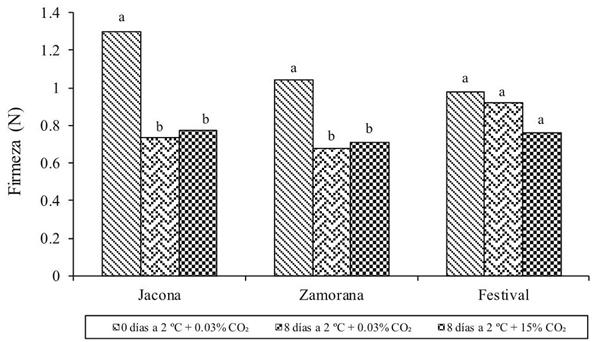 En la firmeza de la pulpa, no se observaron diferencias por efecto de los factores cultivar y concentración de CO2 (Cuadro 1), los valores determinados estuvieron entre 0.675 a 0.918 N. Sin embargo, con relación al valor de firmeza inicial, las variedades Jacona y Zamorana presentaron significativamente mayor pérdida de firmeza respecto a ‘Festival’ durante el almacenamiento (Figura 1), lo que sugirió diferencias en el metabolismo de la pared celular producto del mejoramiento genético de esta variedad (Perkins, 1995; Jiménez-Bermúdez, 2002). Es de señalar que las variedades mexicanas presentaron al inicio del almacenamiento (día 0) una mayor firmeza (Figura 1) con respecto a la variedad ‘Festival’ lo que, de acuerdo con Gooding (1976), es indicativo de mayor resistencia a daños mecánicos y por patógenos.