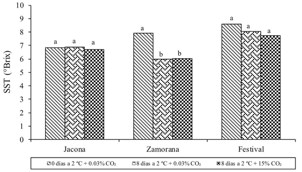 Después del almacenamiento por 8 días a 2 ±1 °C, el contenido de sólidos solubles totales (SST) mostró diferencias significativas sólo debidas al factor variedad, siendo ‘Festival’ mayor (7.9 °Brix) con respecto a ‘Zamorana’ (6 °Brix) (Cuadro 1). Gil et al. (1977) también observaron que la exposición en atmósfera normal (aire) o bajo atmósferas con concentraciones de 10, 20 y 40% de CO2 en frutos de fresa (Fragaria x ananassa cv. Selva) no afectó el contenido de SST. Por otro lado, respecto al tiempo de almacenamiento, dentro de cada variedad, sólo presentó una disminución significativa de SST en ‘Zamorana’ (Figura 5), que sugiere una actividad metabólica mayor en esta variedad.