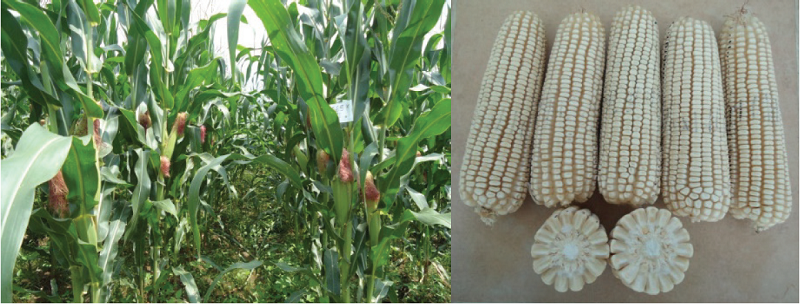 “H-568”. El híbrido es de porte intermedio-alto y ciclo biológico de 125 a 130 días, tiene una altura de planta que varía de 270 a 280 cm, tolerante al acame, hojas rectilíneas ligeramente onduladas del margen laminar, de color verde medio, con floración masculina a los 58 días y dos días después la femenina; espiga semi-abierta con 13 a 15 ramas laterales primarias, estigmas de color rosa; mazorca cilíndrica de buena cobertura de las brácteas, tiene 15 a 20 cm de longitud con 14 a 18 hileras rectas y 31 a 40 granos por hilera de color blanco cremoso y textura dentada, el aspecto de planta y mazorca se muestran en la Figura 1. Además, presenta buenas características y propiedades para la producción de elote y forraje, cumple con los parámetros comerciales e industriales para la elaboración de tortillas por el método tradicional, nixtamal-masa-tortilla.