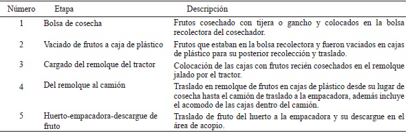 El proceso de cosecha, recolección y transporte a la empacada se dividió en 5 etapas (Cuadro 1). Las cuadrillas iniciaron la cosecha a las 8:00 am. Cada cuadrilla estuvo compuesta de 11 personas, de las cuales se seleccionaron tres cortadores al azar. La jornada de trabajo duró entre 5- 6 h, y se realizaron evaluaciones 1, 3 y 5 h después del inicio del corte de fruto. La evaluación comenzó en cada hora evaluada, con la medición de los frutos en la etapa 1 (Cuadro 1), la caja de acarreo donde fueron colocados los frutos (etapa 2) fue marcada para darle seguimiento en las etapas posteriores (etapa 3 a 5).