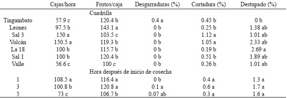 El número de cajas y frutos por hora evaluada fue diferente (p< 0.05). Siendo la hora 1 y 3 donde se cosechan más cajas y donde se colocan más fruto por caja. Las cortaduras y destupado no presentaron diferencias significativas entre las horas evaluadas (p> 0.05), esto indica que los cosechadores ocasionan este daño mecánico a cualquier hora y al mismo ritmo (Cuadro 2); sin embargo, las desgarraduras si presentaron diferencias (p< 0.05), siendo a las tres horas donde se ocasionan los mayores porcentajes (Cuadro 3).
