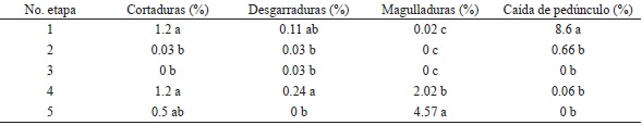 La ocurrencia de daños mecánicos fue diferente en las etapas evaluadas (p< 0.05). Las cortaduras ocurrieron con mayor frecuencia en las etapas 1 y 4. La etapa 4 fue la de mayor porcentaje de desgarradura, seguido por la etapa 1.