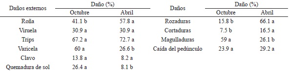 El efecto de los daños externos y mecánicos sobre la calidad se muestran en el Cuadro 4, en cual se puede observar que los porcentajes de daños por viruela, trips, clavo y caída de pedúnculo fueron iguales estadísticamente en las dos épocas de cosecha (p> 0.05). Los daños externos como roña, varicela, quemadura de sol, rozaduras, cortaduras y magulladuras en el fruto fueron diferentes en las dos épocas de muestreo (p> 0.05). Los daños por roña, rozaduras, cortaduras, presentaron mayor frecuencia en cosechas de abril que en las de octubre. Mientras que, daños por varicela, quemaduras de sol y magulladuras fueron mayores en octubre que en abril (Cuadro 4). Aunque los resultados muestran que gran parte de los frutos presentan al menos un tipo de daño externo o mecánico, la NMX-FF-016-SCFI- 2006 (Secretaría de Economía, 2006) establece criterio de calidad, se acepta hasta 2 cm2 de daños por roña, trips y rozaduras, pero no se permiten daños por varicela, viruela, clavo, quemadura de sol y daños mecánicos.