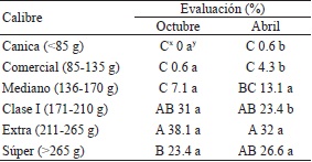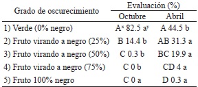 Los resultados de los calibres y estado de madurez del fruto cosechado se muestran en el Cuadro 5, el cual muestra que existen diferencias estadísticas significativas entre los calibres cosechados, estado de madurez del fruto y entre época de cosecha (p< 0.05). En octubre, los calibres clase I, extra y súper extra representaron 92% de los frutos cosechados, mientras que en abril los mismos calibres disminuyeron a 82%. Frutos con calibre canica y comercial presentaron mayor frecuencia en cosechas de abril, mientras que aquellos con calibre clase I muestran mayores porcentajes en cosechas de octubre. Cosechas de abril mostraron mayor porcentaje (24%) de frutos más negros (frutos virados a negro 50%, frutos virados a negro 75% y frutos totalmente negros), mientras que frutos con las mismas características, cosechados en octubre, presentaron porcentajes cercanos a 3% (Cuadro 6). Osuna et al. (2010) reportaron que el oscurecimiento de la piel no afecta la calidad y la vida poscosecha del aguacate ‘Hass’ en Michoacán; no obstante, se considera que el grado de color de la piel es una medida de madurez.