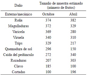 Los tamaños de muestra calculados con las proporciones de daños externos y mecánicos obtenidas en el estudio 2, para cada uno de los daños se muestran en el Cuadro 7. Los mayores tamaños de muestra, estimados para las cosechas de octubre, correspondieron para los daños por roña, magulladuras y varicela con 374, 372 y 369 frutos por lote cosechado, mientras que, para cosechas de abril, los mayores tamaños de muestra fueron para roña, caída de pedúnculo y magulladuras con 382, 340 y 329 frutos por lote cosechado.