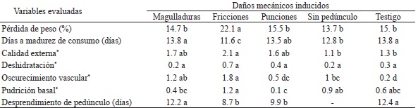 Los daños mecánicos disminuyeron la calidad de los frutos en madurez de consumo. Las fricciones y punciones fueron las que más afectaron la calidad, disminuyendo los días a madurez de consumo, mayor daño por oscurecimiento vascular, pudrición basal y calidad externa.
