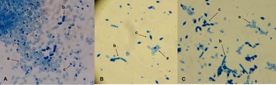 Se procesaron 62 muestras representativas de diversos materiales colectados, entre los cuales se incluyó 18 muestras de suelo, 10 de Spodoptera frigiperda, 23 de Chlosyne lacinia ssp. lacinia, dos de Aidemona azteca, cuatro de hojas de Nerium oleander y cinco muestras de rastrojo de Zea mays. Se seleccionaron en total 210 colonias, de las cuales sólo en 27 se observó la presencia de estructuras en los esporangios, entre las cuales se observaron cuerpos esféricos, amorfos, bipiramidales, cúbicos, ovoides y algunos adheridos a las esporas. La prueba de tinción con azul de Coomassie (Figura 1) permitió confirmar sólo en tres aislados la presencia de cristales parasporales, los cuales fueron designados con las claves ITCBT34, ITCBT61 e ITCBT62 (Cuadro 2). Estos aislados seleccionados fueron utilizados en las pruebas posteriores.