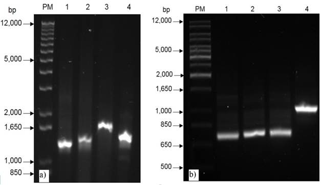 Los tres aislados mostraron la presencia de genes cry, presentaron bandas de amplificación con tamaños aproximados de 1400 pb (ITCBT61), 1500 pb (ITCBT62), 1650 pb (ITCBT34) y 1300 pb en la cepa de referencia (HD1) (Figura 2a). El uso de iniciadores universales es común para determinar la presencia de genes cry (Patel et al., 2012; Reinoso-Pozo et al., 2016). De acuerdo a la morfología bipiramidal de los cristales parasporales de los aislados ITCBT61 e ITCBT62, es probable que las bandas de amplificación estén correlacionadas con genes tipo cry1 y cry2, los cuales codifican proteínas tóxicas principalmente hacia larvas de Lepidópteras (Sun et al., 2007; Sauka y Benintende, 2008). Por otro lado, el fragmento amplificado en el aislado ITCBT34 muestra un tamaño de banda diferentes (Figura 2a), por lo que podría tratarse de otro tipo de gen cry.
